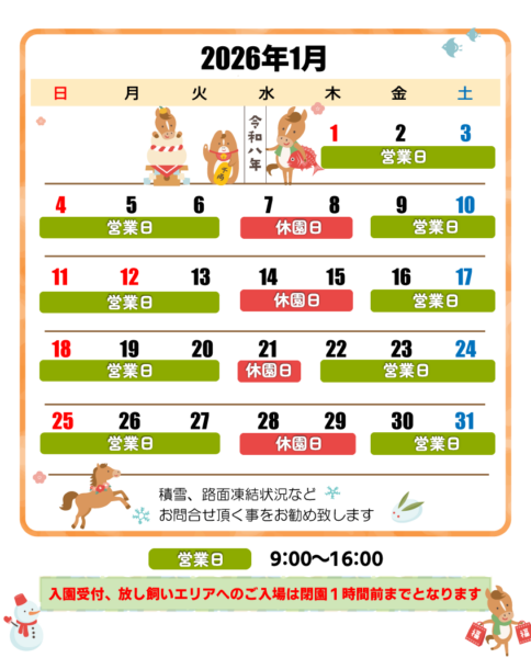 ※悪天候及び施設のメンテナンス等により、開園・閉園時間の変更もしくは休園する場合があります。
