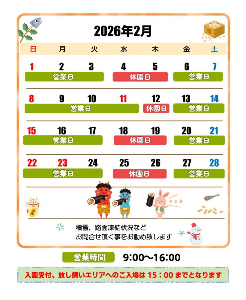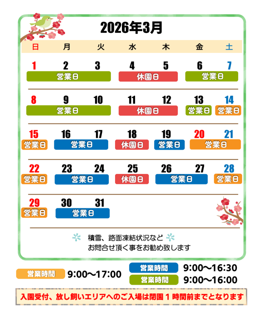 ❄️除雪、融雪作業により開園時刻が遅くなる場合もございます。